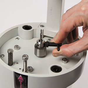 Details are very important when designing a good pin drill: the drill-anchoring system has to be ease to loosen. In the case of the Atlas pin drill, a few seconds are enough to replace the drill or adjust its height.