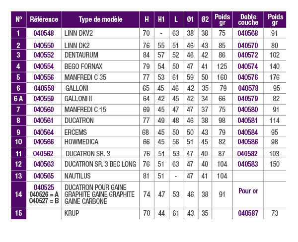| Producto | 1 – LINN DKV2, 1 – LINN DKV2 (10 U.), 2 – LINN DK2, 2 – LINN DK2 (10 U.), 3 – DENTAURUM, 3 – DENTAURUM (10 U.), 4 – BEGO FORNAX, 4 – BEGO FORNAX (10 U.), 5 – MANFREDI C 35, 5 – MANFREDI C 35 (10 U.), 6 – GALLONI, 6 – GALLONI (10 U.), 6A – GALLONI II, 6A – GALLONI II (10 U.), 7 – MANFREDI C 15, 7 – MANFREDI C 15 (10 U.), 8 – DUCATRON, 8 – DUCATRON (10 U.), 9 – ERCEMS, 9 – ERCEMS (10 U.), 10 – HOWMEDICA, 10 – HOWMEDICA (10 U.), 11 – DUCATRON SR. 3, 11 – DUCATRON SR. 3 (10 U.), 12 – DUCATRON SR. 3 BEC LONG, 12 – DUCATRON SR. 3 BEC LONG (10 U.), 15 – KRUP |