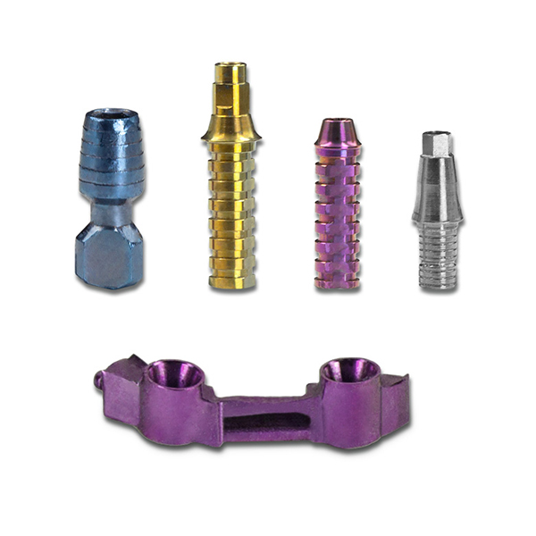 La capa anódica puede ser coloreada con diferentes tonalidades. Esta ventaja es especialmente interesante cuando el elemento anodizado sirva de soporte de un material translúcido como el circonio, o para las barras sobre implantes.