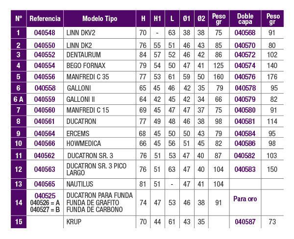 | Producto | 1 – LINN DKV2, 1 – LINN DKV2 (10 U.), 2 – LINN DK2, 2 – LINN DK2 (10 U.), 3 – DENTAURUM, 3 – DENTAURUM (10 U.), 4 – BEGO FORNAX, 4 – BEGO FORNAX (10 U.), 5 – MANFREDI C 35, 5 – MANFREDI C 35 (10 U.), 6 – GALLONI, 6 – GALLONI (10 U.), 6A – GALLONI II, 6A – GALLONI II (10 U.), 7 – MANFREDI C 15, 7 – MANFREDI C 15 (10 U.), 8 – DUCATRON, 8 – DUCATRON (10 U.), 9 – ERCEMS, 9 – ERCEMS (10 U.), 10 – HOWMEDICA, 10 – HOWMEDICA (10 U.), 11 – DUCATRON SR. 3, 11 – DUCATRON SR. 3 (10 U.), 12 – DUCATRON SR. 3 PICO LARGO, 12 – DUCATRON SR. 3 PICO LARGO (10 U.), 13 – NAUTILUS, 13 – NAUTILUS (10 U.), 14 – DUCATRON PARA FUNDA, 14A – FUNDA DE GRAFITO, 14B – FUNDA DE CARBONO |